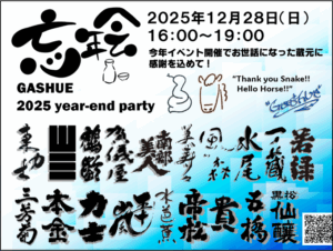 今年も、2025年のイベントの開催でお世話になった19蔵の新酒を中心としたお酒を楽しみながら、ワイワイ・ガヤガヤとみんなで「年忘れ」を行います。